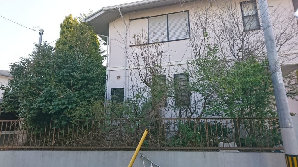 ちなみにコニファーは葉が密に茂っているため大変重さがあります。こんな場所では伐採するにも苦労しますね。ご自分では絶対に手を出さない方がいいです。